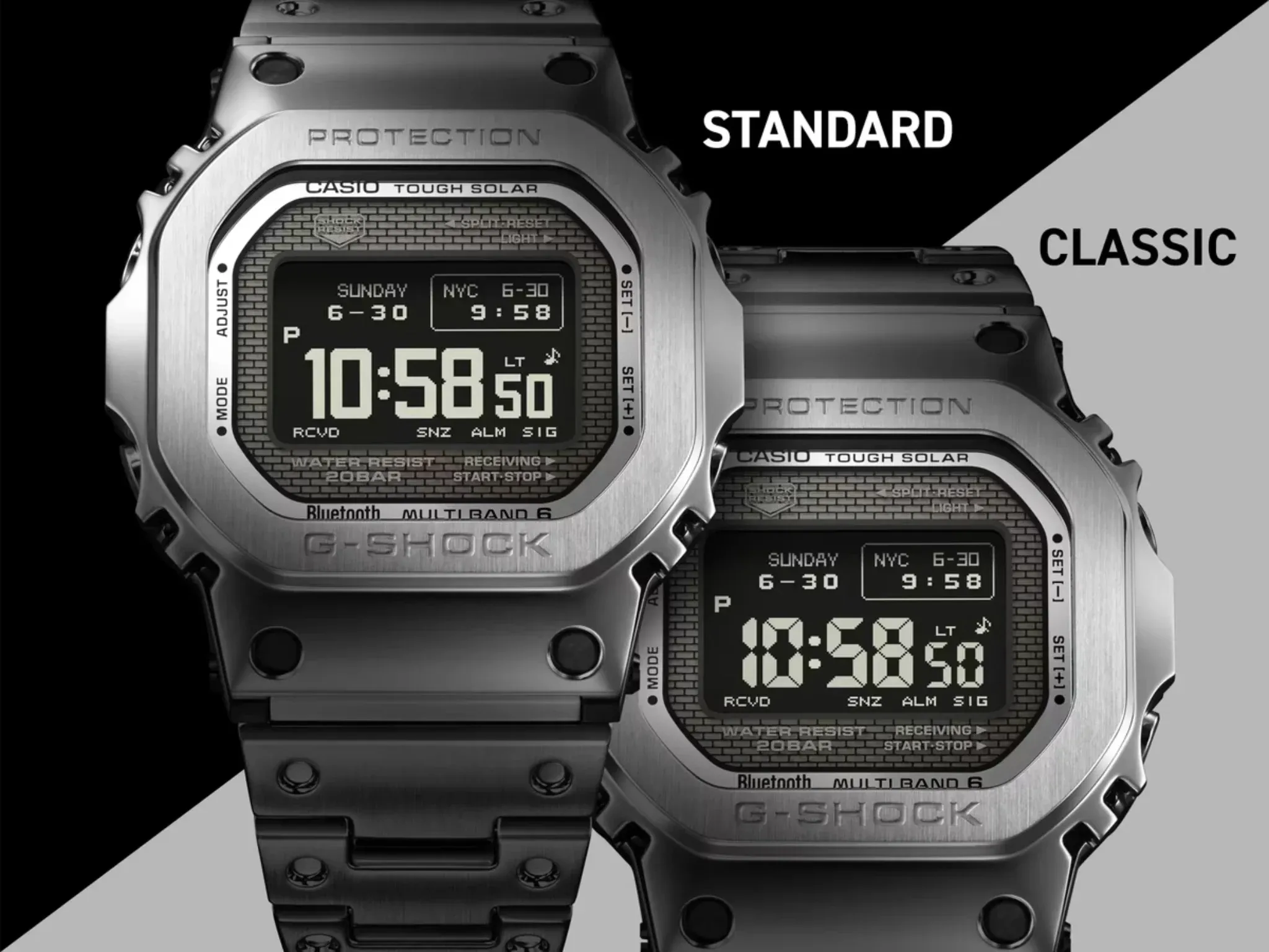 Bien que beaucoup considèrent l’écran LCD MIP comme une amélioration majeure par rapport à l’écran LCD STN de la GMW-B5000 et que le prix plus élevé de la GMW-BZ5000 soit quelque peu négligeable, la GMW-B5000 présente quelques avantages, tels que 5 réglages de l’heure mondiale contre 2, une durée de rétroéclairage de 2 ou 4 secondes contre 1,5 ou 3, la fonction Bluetooth de rappel pour jusqu’à 5 dates importantes avec un titre de 18 caractères chacune, et, selon les préférences de chacun, le fait qu’elle soit plus fidèle au boîtier et à la structure de la lunette de la DW-5000C originale.