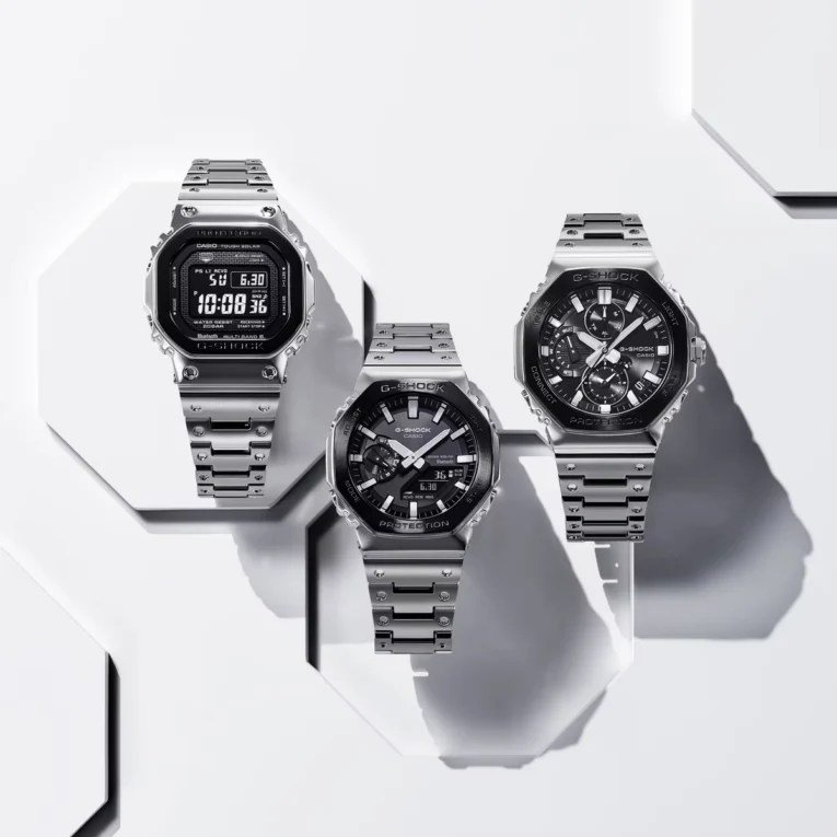 Les GMW-B5000BT-1JF (88 000 yens), GM-B2100BT-1AJF (88 000 yens) et GMC-B2100BT-1AJF (107 800 yens) sont un trio de modèles de luxe entièrement en métal avec une section de lunette avant plaquée ionique noire, similaire au style vu sur les modèles en résine bicolore DW-5610 et GA-2110 .