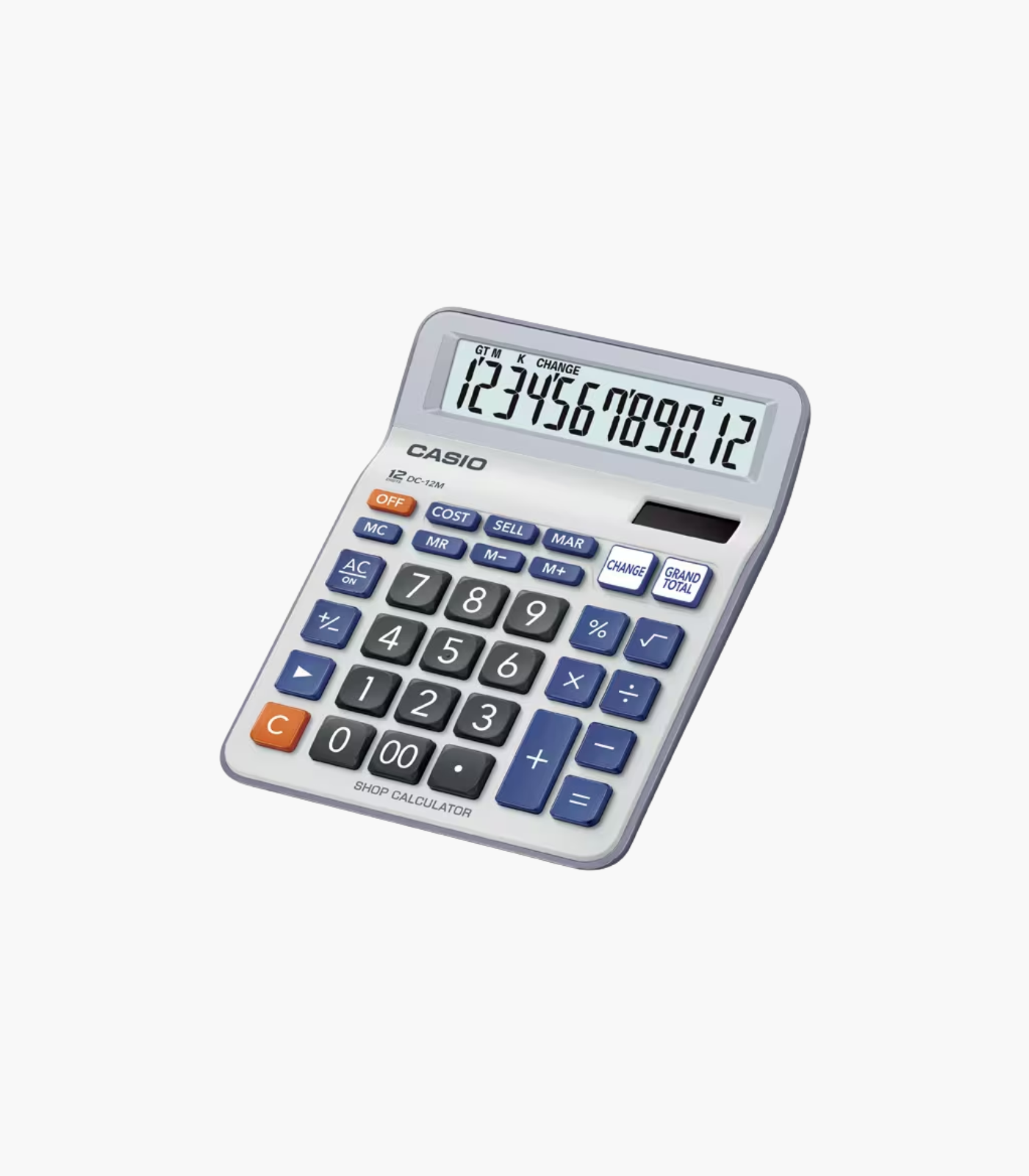 Calculatrice de bureau Casio – 12 chiffres, écran LCD incliné, solaire et pile, fonctions marge et mémoire, plastique, gris – DC-12M