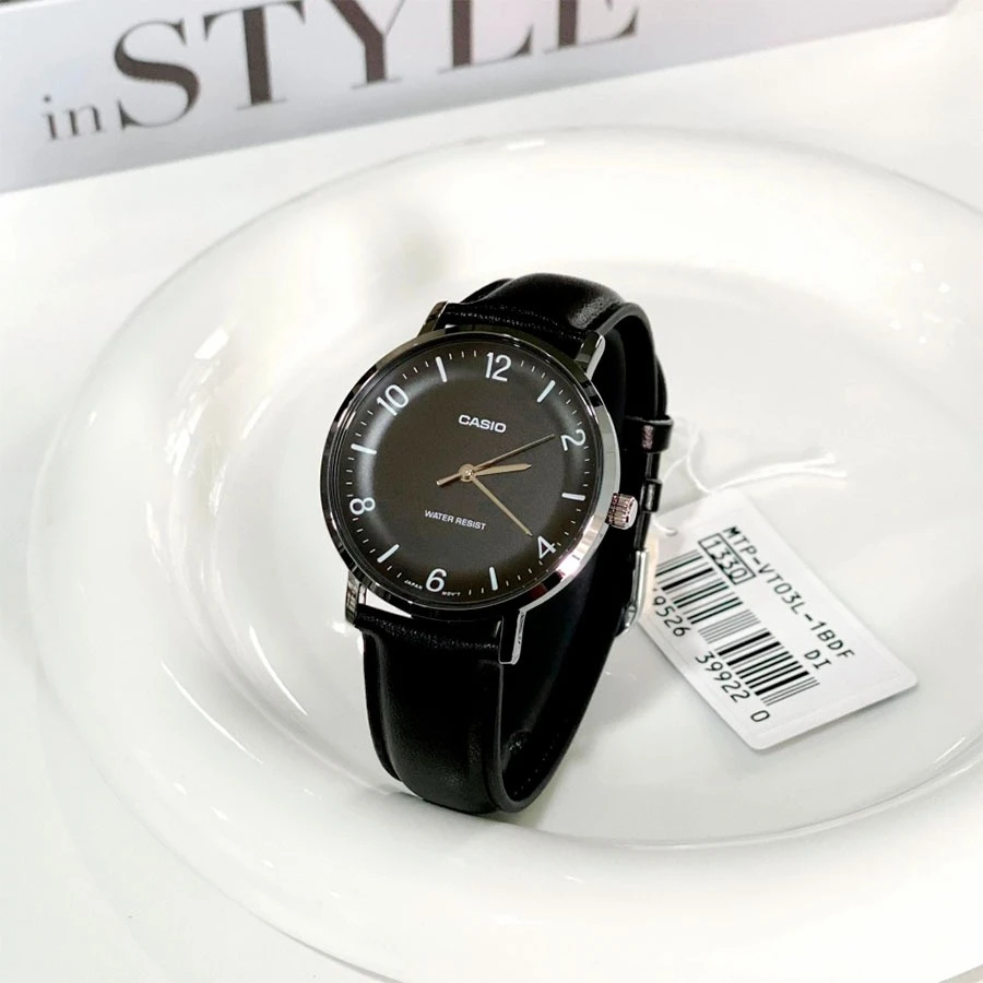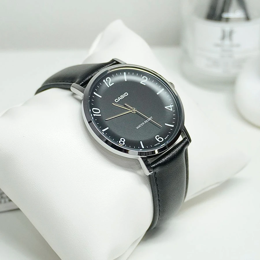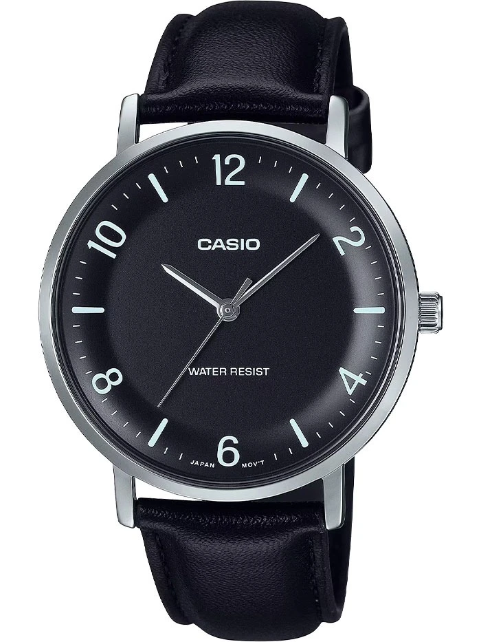 Montre Analogique Casio Pour Homme, Bracelet en Cuir Noir Minimaliste, Cadran Noir Concave, 3 Aiguilles – MTP-VT03L-1BDF