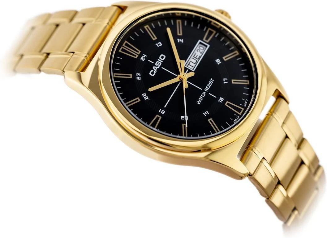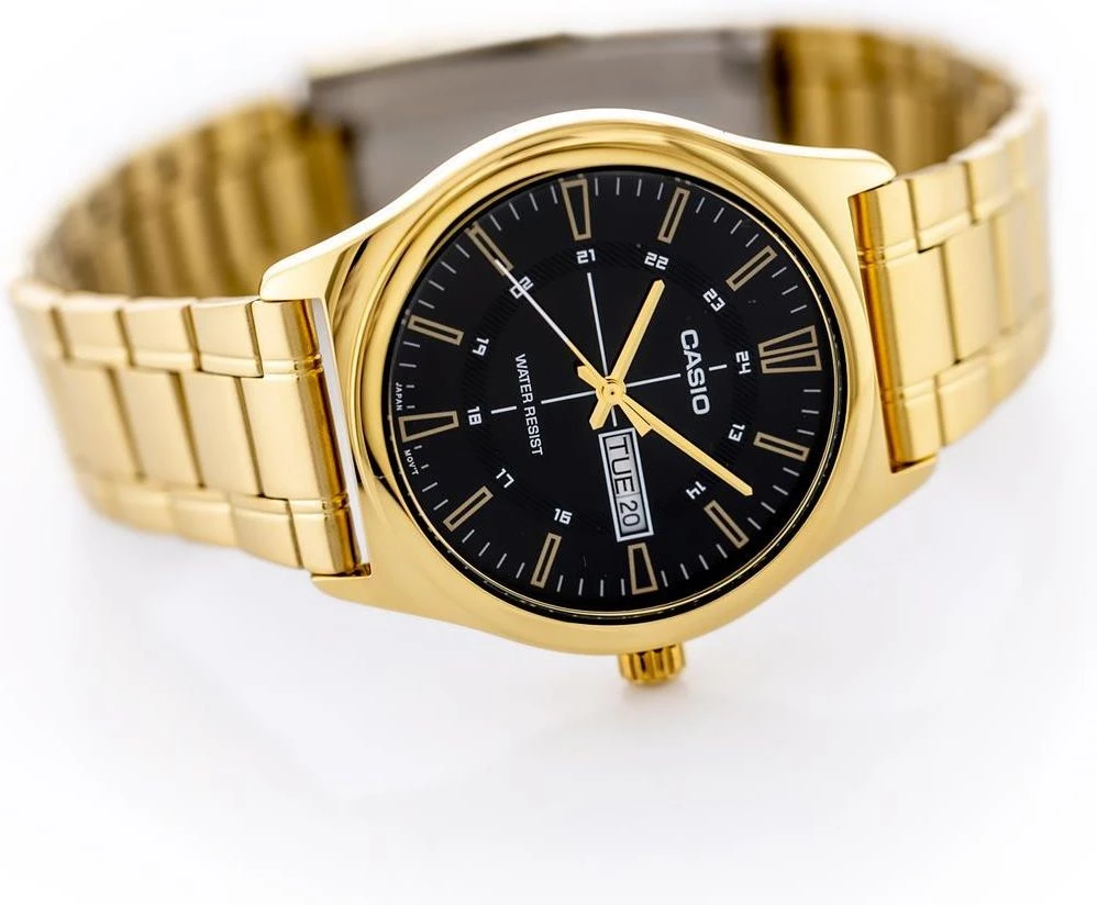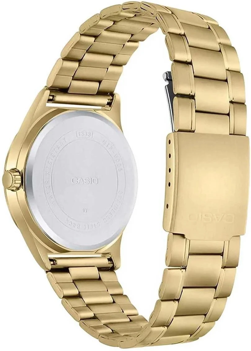 Montre Analogique Homme – Bracelet Acier Inoxydable Plaqué Or – Résistant à lEau – Affichage Jour et Date – Chronographe – Verre Minéral – Boîtier 45,1 mm – Fermoir Triple – MTP-V006G-1CUDF