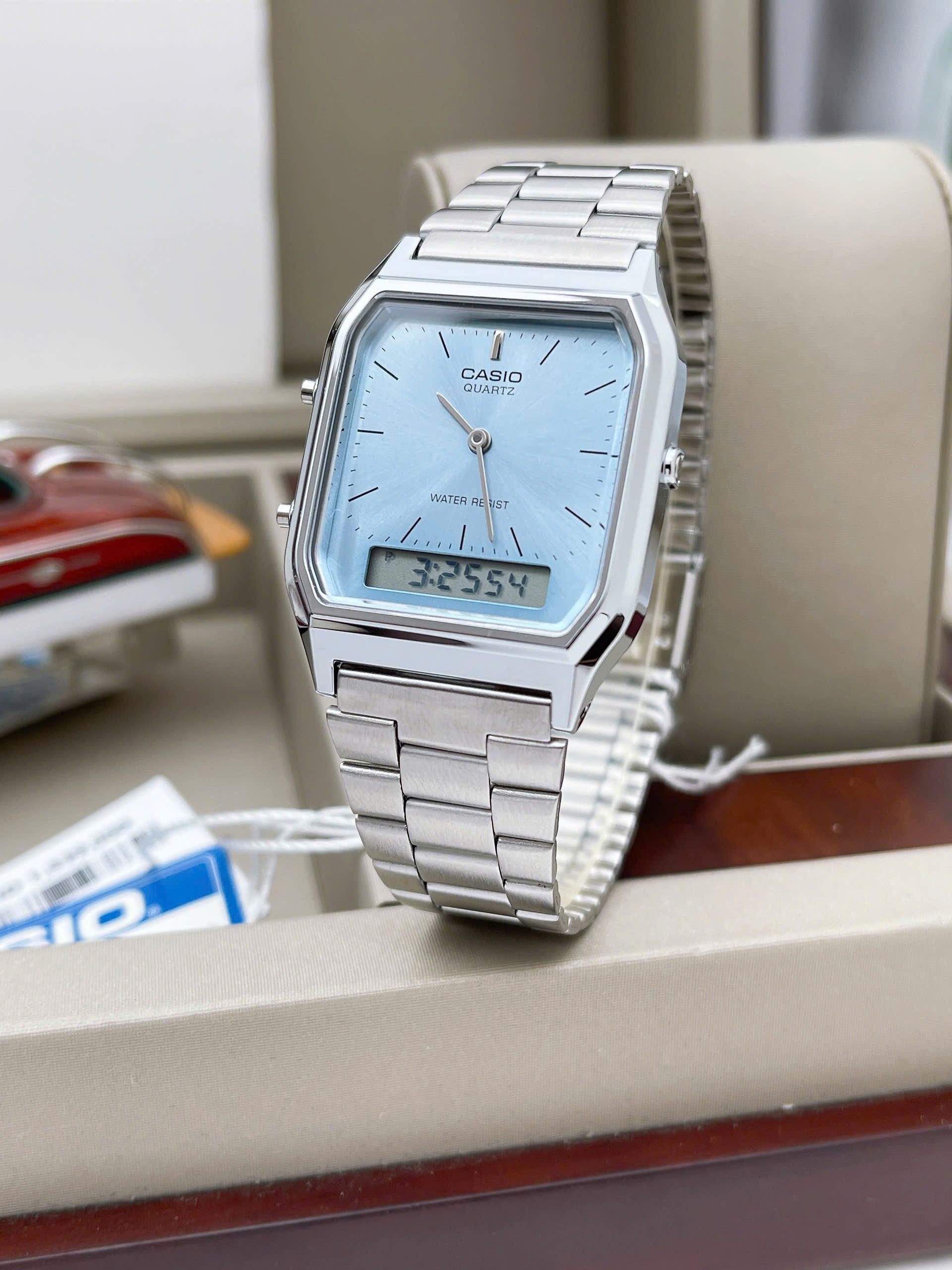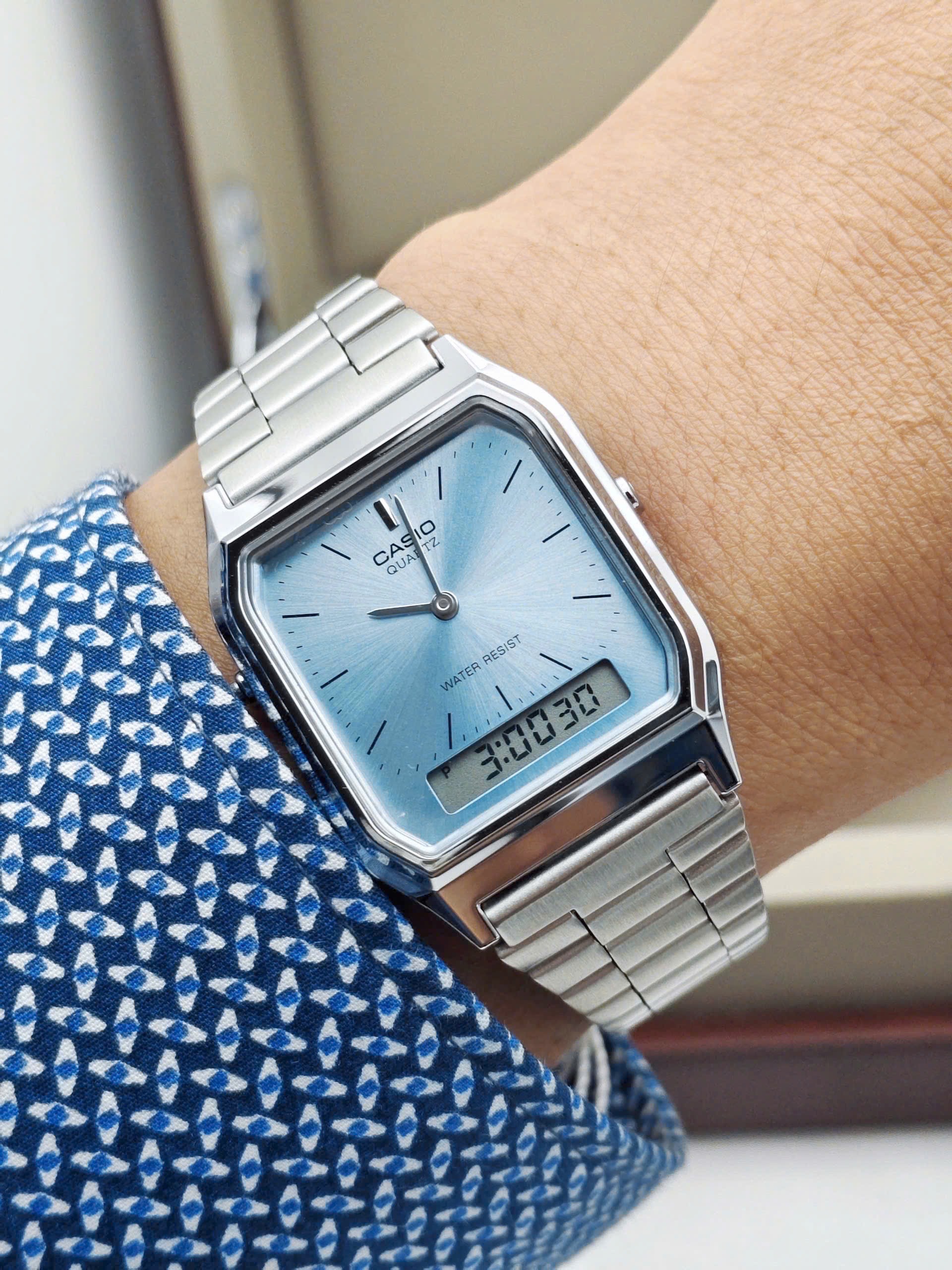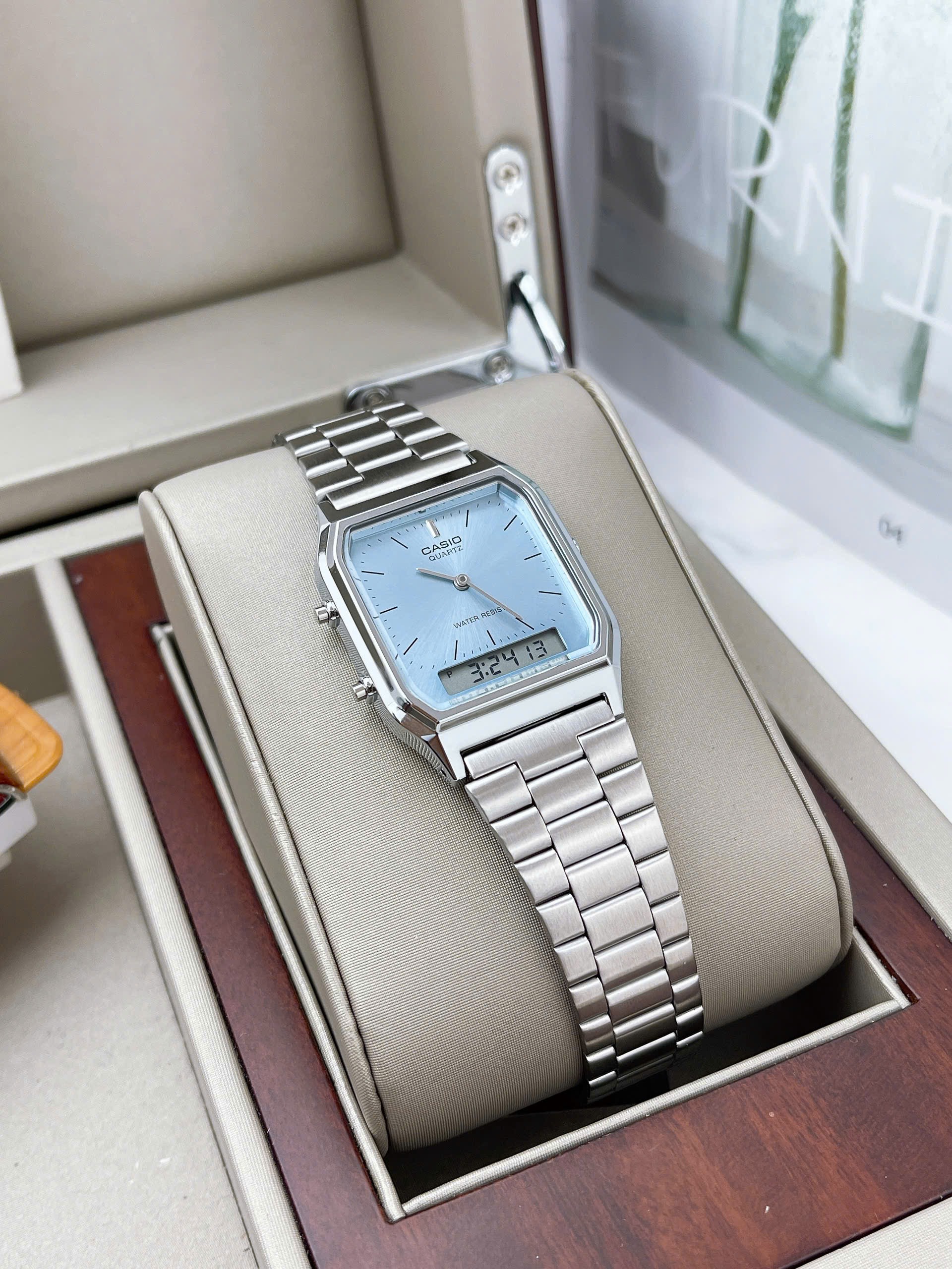 Le bracelet en acier inoxydable de la Casio AQ-230A-2A1MQYDF est un élément incontournable de son design. Non seulement il ajoute une touche de sophistication, mais il est également extrêmement confortable à porter grâce à sa flexibilité et sa résistance à la corrosion. L’acier inoxydable est connu pour sa longévité, et son entretien est relativement simple. Cette combinaison de matériaux assure une montre qui non seulement a fière allure, mais qui est également conçue pour durer, permettant à l’utilisateur de profiter de son style au quotidien.