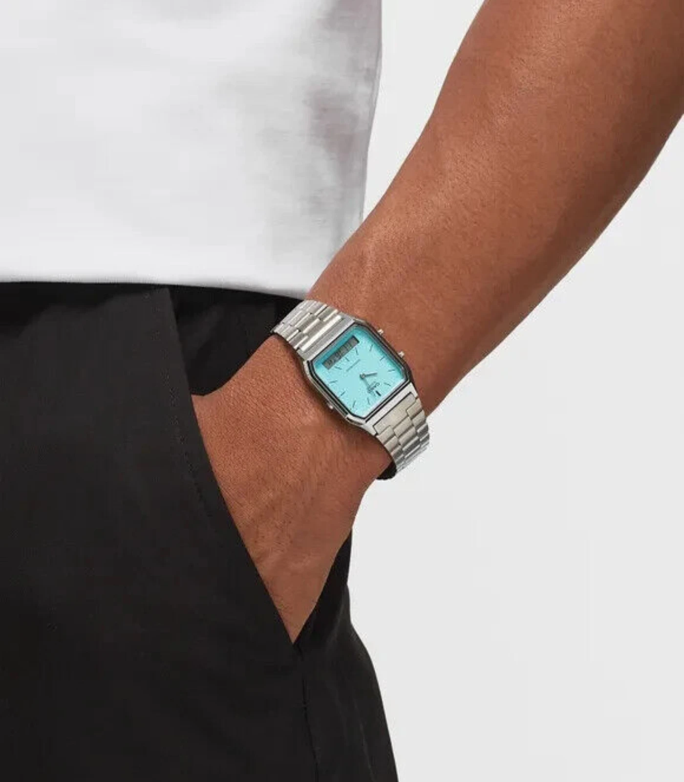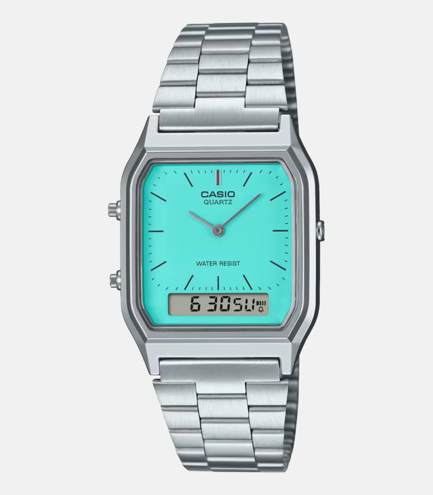 Charmant classique, tendance et coloré. Le boîtier angulaire encadre un cadran mis à jour selon les dernières tendances en matière de couleurs. La simplicité rétro rencontre la fonctionnalité moderne dans une montre analogique avec une petite fenêtre numérique pour les informations dont vous avez besoin à portée de main. Un design polyvalent et élégant pour compléter chaque occasion, des événements formels habillés aux sorties décontractées. Choisissez parmi trois superbes options de couleurs : bleu glacier, bleu turquoise ou argent.