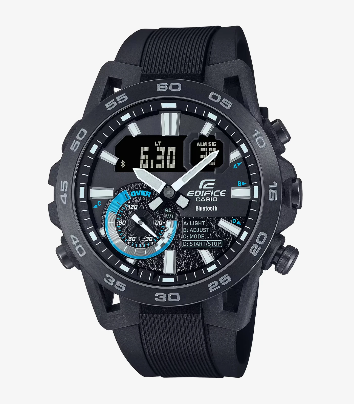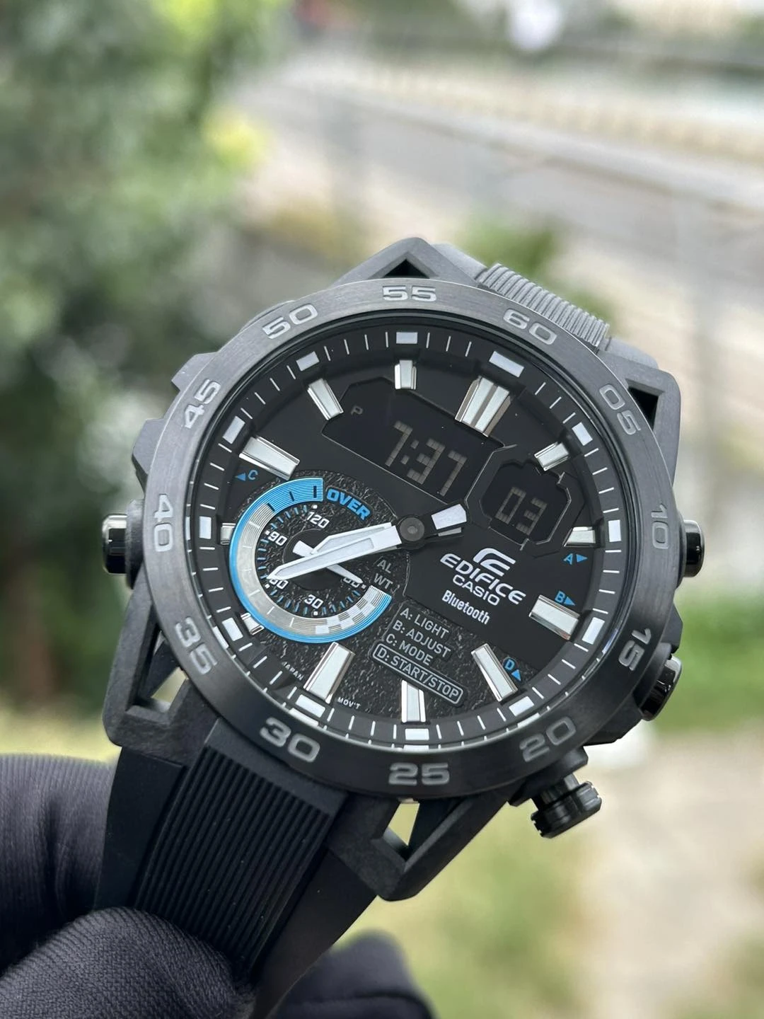 La montre Casio Edifice ECB-40PB-1ADF se distingue non seulement par sa performance mais également par son design soigneusement élaboré. L’un des éléments clés de son charme réside dans le boîtier, qui combine des matériaux avancés tels que le carbone et l’acier inoxydable. Le choix du carbone permet de réduire le poids de la montre tout en augmentant sa résistance aux chocs. Ce matériau est reconnu pour sa durabilité et contribue ainsi à la longévité de la montre, un aspect essentiel pour les utilisateurs actifs.