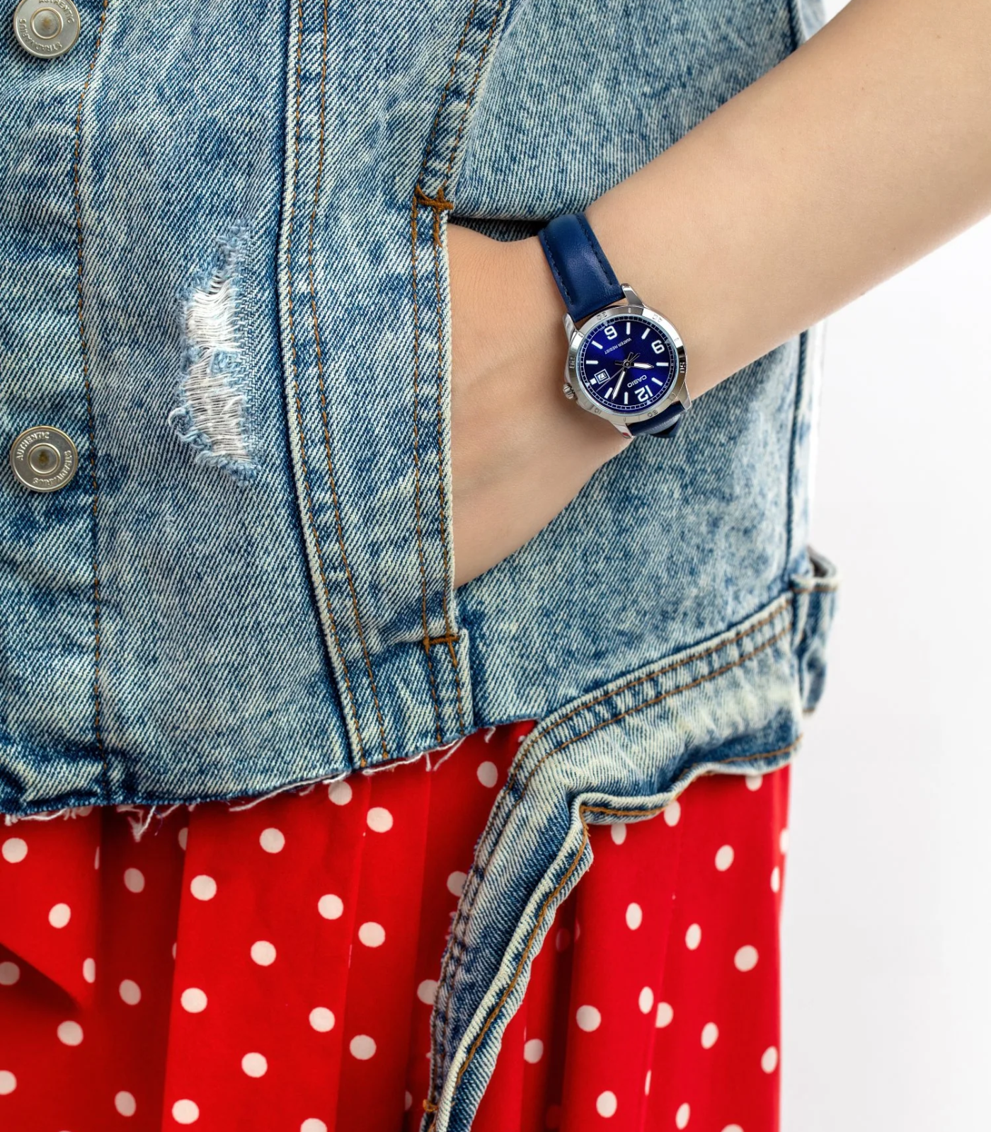 Le bracelet de la montre Casio LTP-V004L-2BUDF est fabriqué en cuir véritable de haute qualité, d’une couleur bleu profond qui s’harmonise parfaitement avec le cadran de la montre. Le cuir utilisé est doux au toucher, agréable à porter et suffisamment flexible pour épouser la forme du poignet de manière confortable. Ce bracelet en cuir est un choix parfait pour celles qui cherchent à allier confort et style au quotidien.
