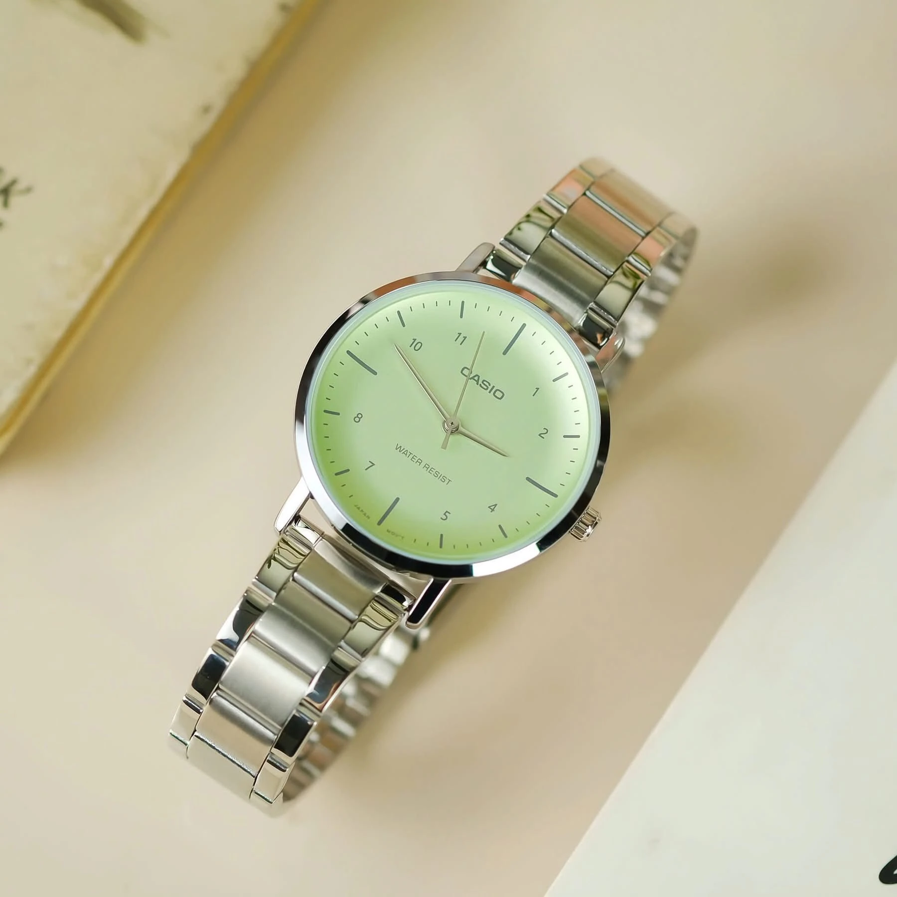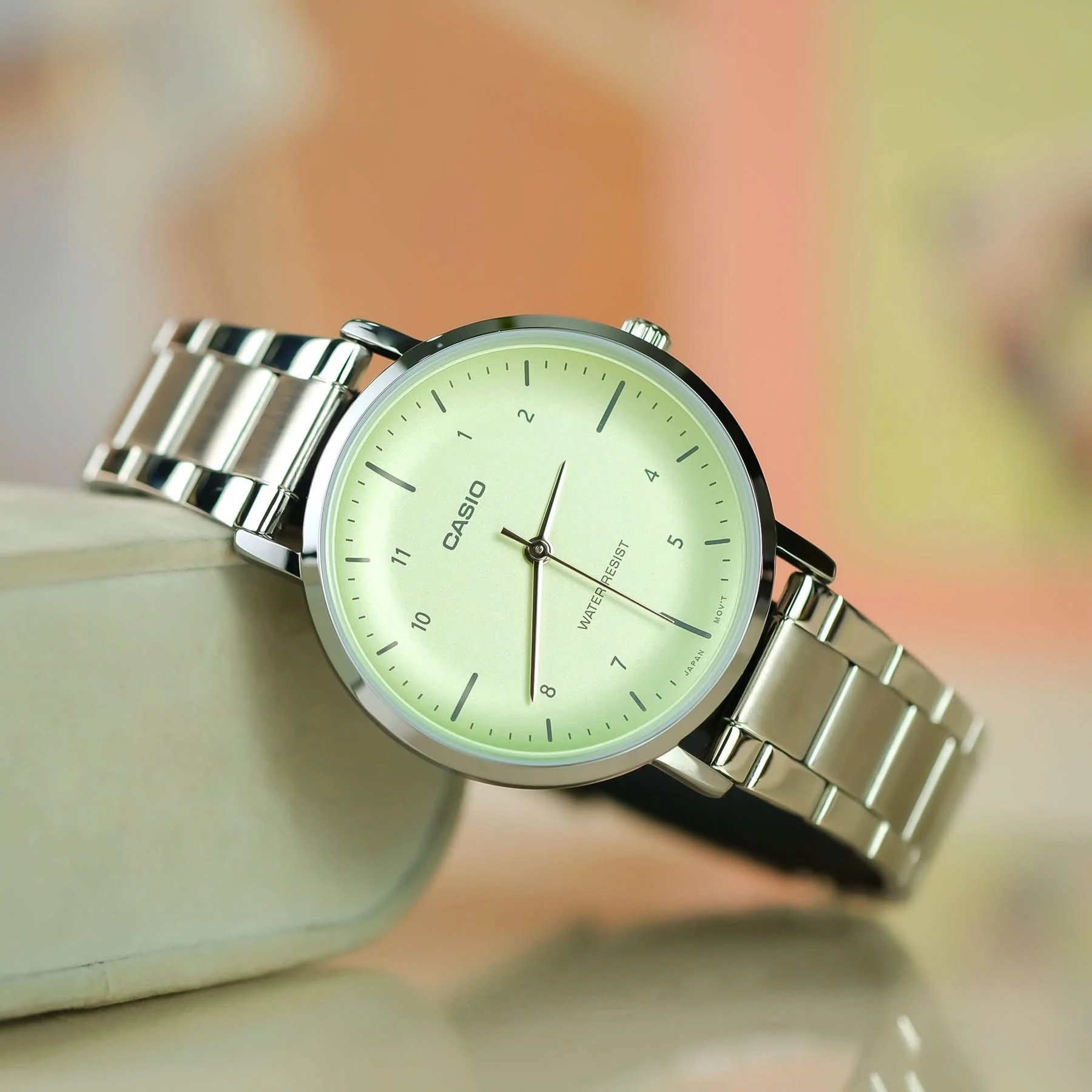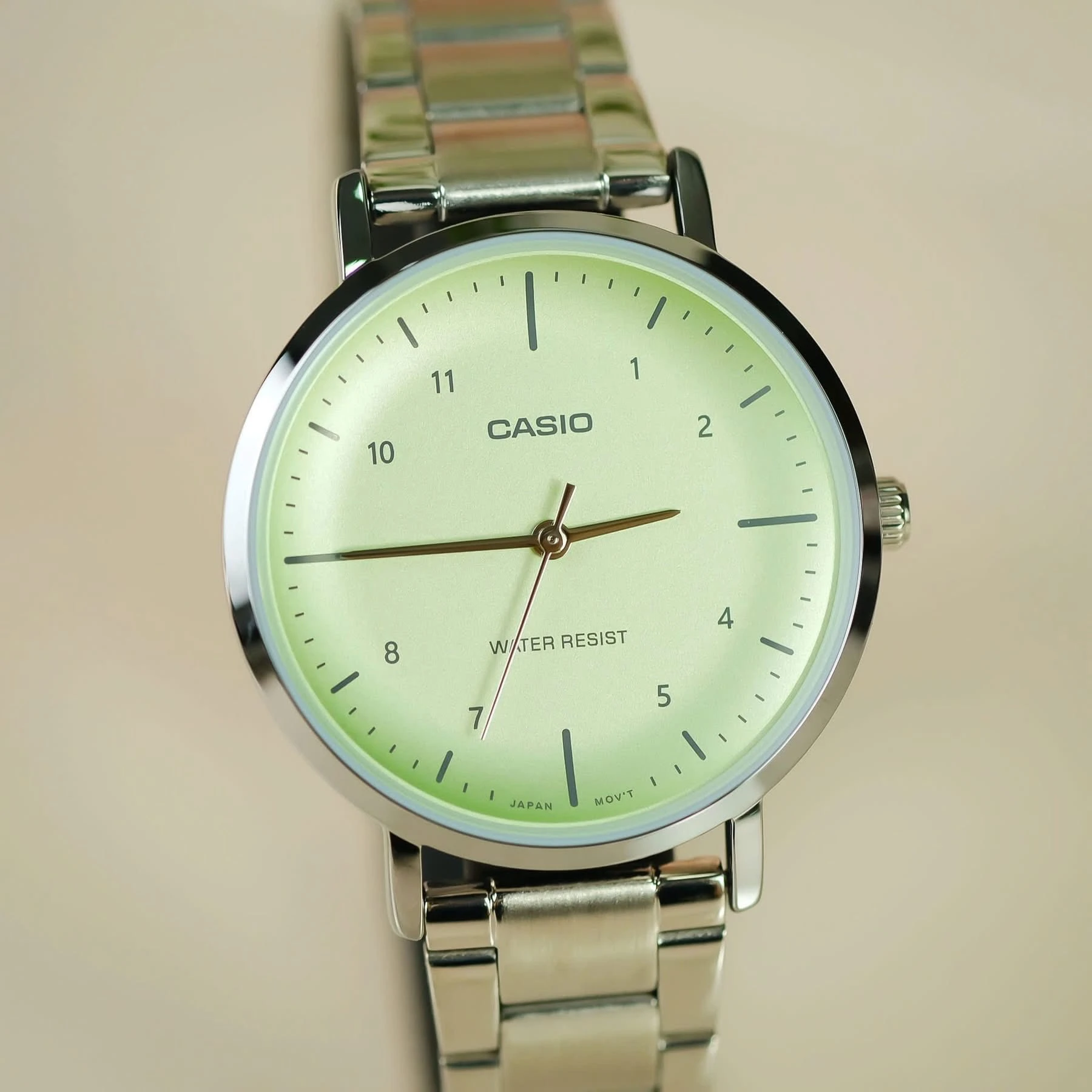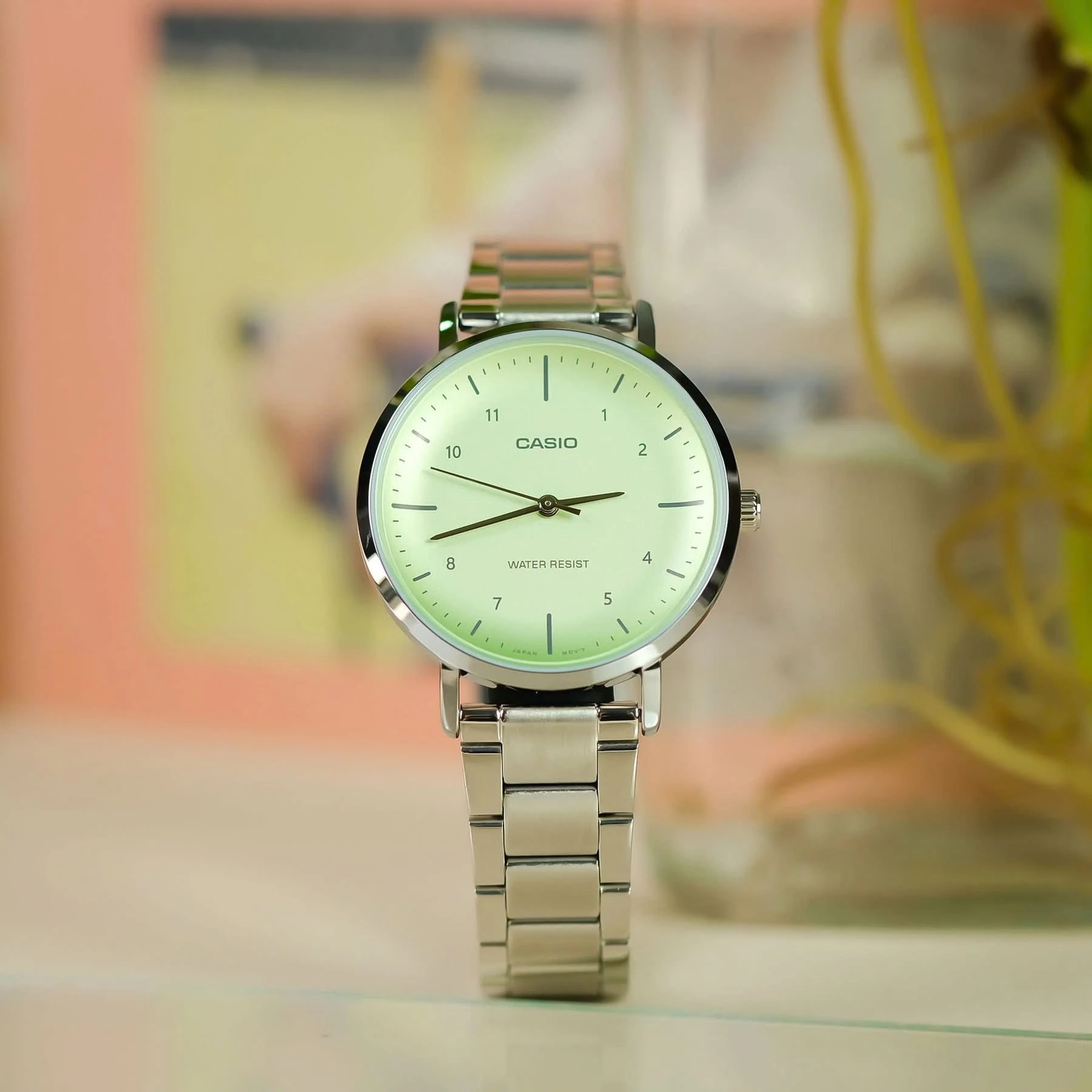 Montre Casio Femme – LTP-VT03D-3BDF – Acier inoxydable, Cadran vert, Affichage analogique, Calendrier jour-date-mois, Bracelet multicolore