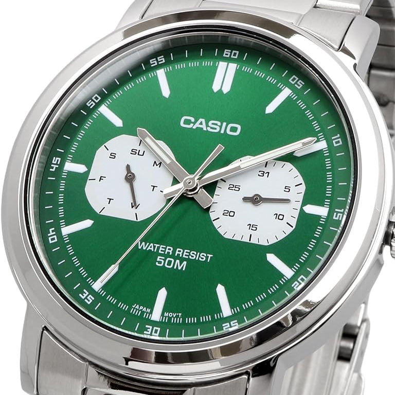 Montre Classique Homme – Casio – Acier Inoxydable, Étanche 50m, Bracelet Métal, Cadran Vert – Réf. MTP-E335D-3EVDF