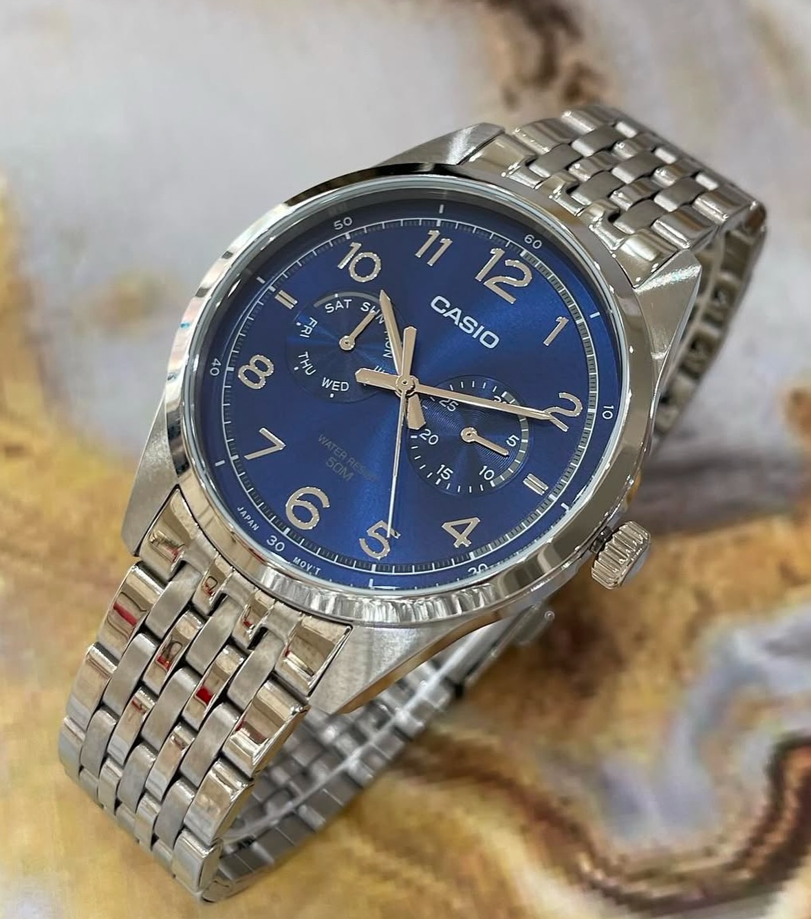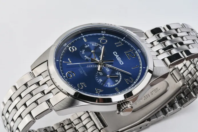 Montre Classique Homme – Casio – Quartz, Acier Inoxydable, Affichage Jour/Date, Étanche 50M, Bracelet Métal, Cadran Bleu – MTP-E340D-2AVDF