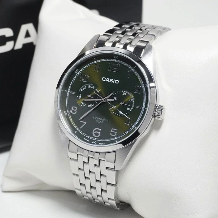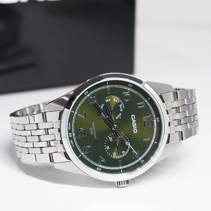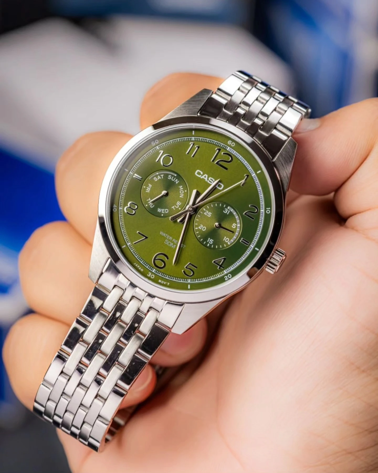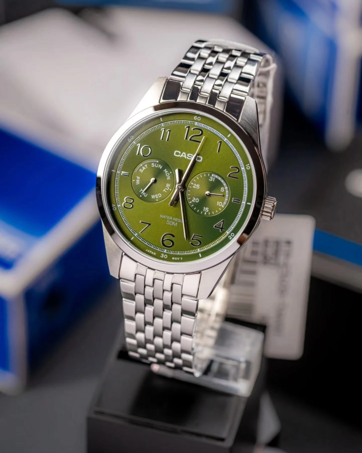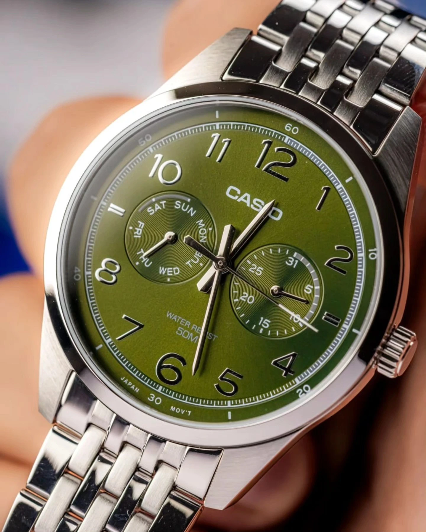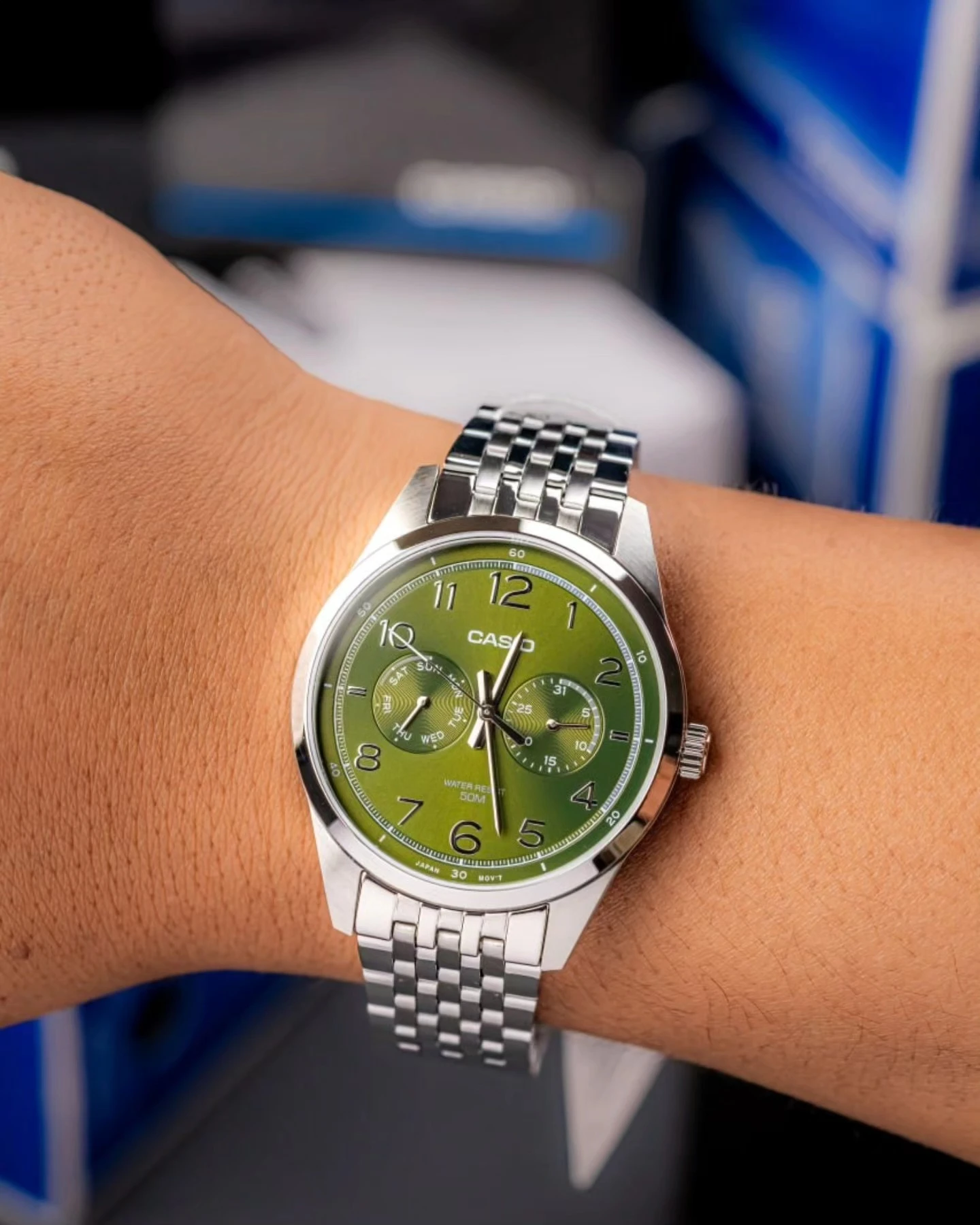 Montre Classique Homme – Casio – Quartz, Acier Inoxydable, Affichage Jour/Date, Étanche 50m, Cadran Vert, Bracelet Argenté – MTP-E340D-3AVDF