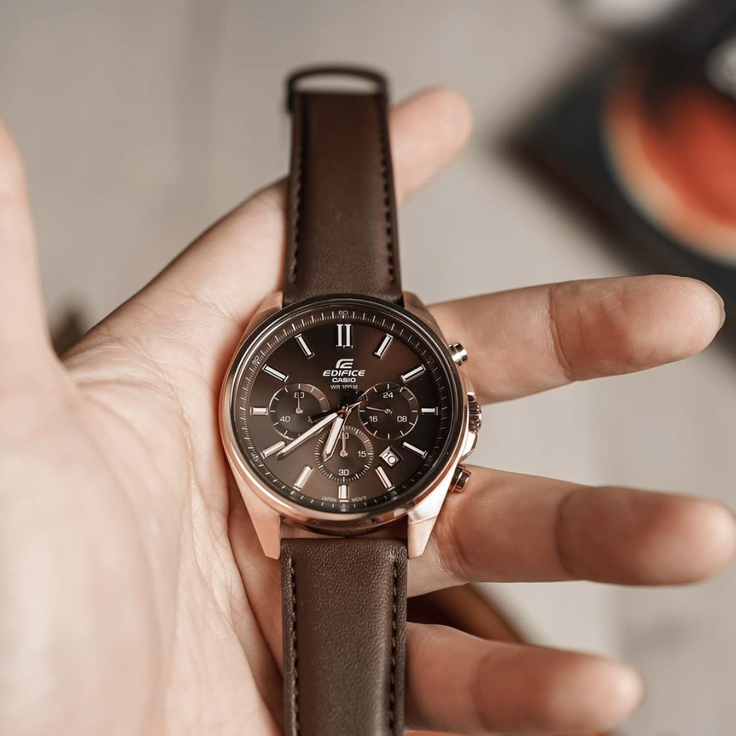 Montre Classique Homme EFV-650CL-5AVUDF – Casio – Chronomètre, Étanchéité 100m, Bracelet cuir véritable, Boîtier acier inoxydable – Plaqué or rose – Ref. EFV-650CL-5AVUDF