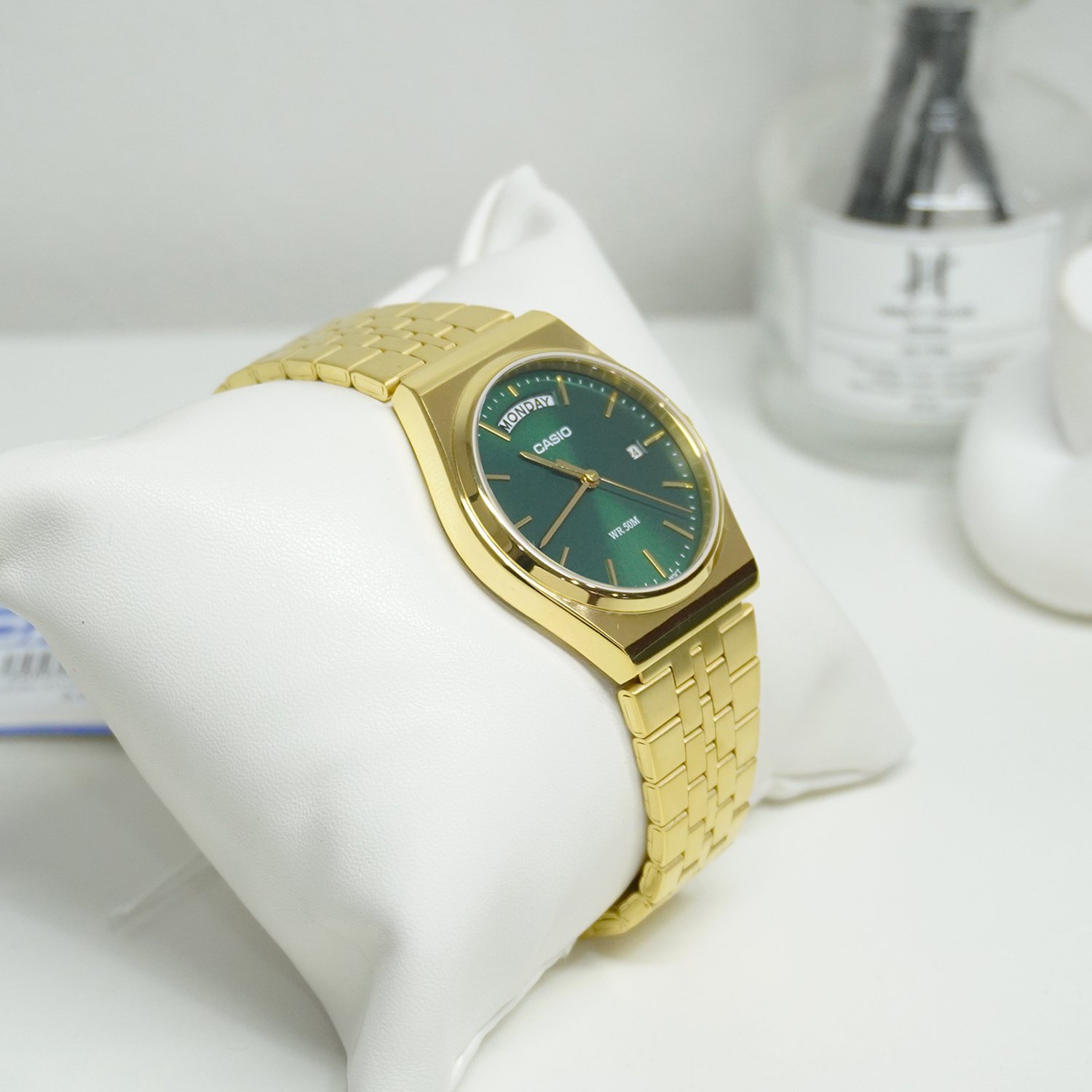 Montre Homme – Casio – Cadran vert, Bracelet acier inoxydable doré, Étanche, Quartz – Acier inoxydable – Doré – MTP-B146G-3AVDF