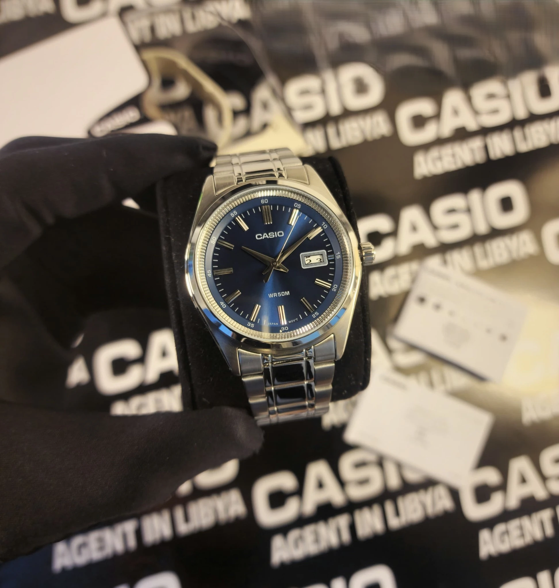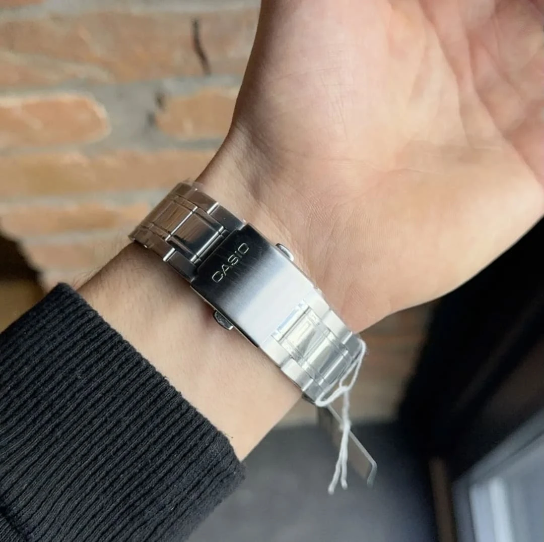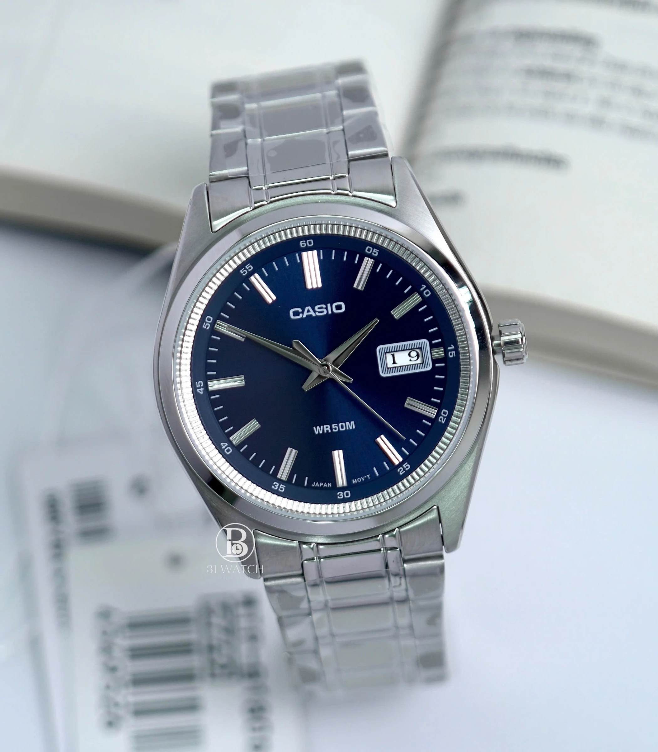 Montre homme Casio MTP-B180D-2AVDF – Acier inoxydable, Bracelet acier, Verre minéral, Étanche 50m, Date, 3 ans autonomie – Argenté/Bleu