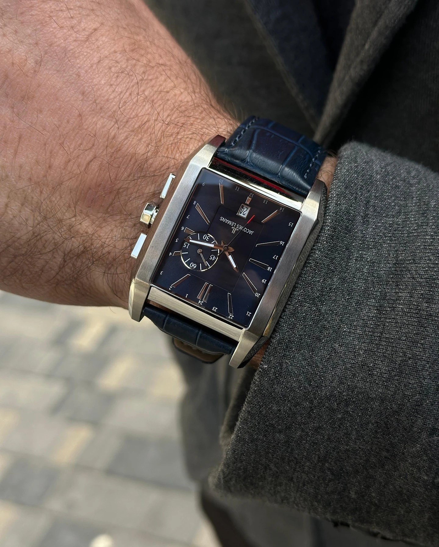 Montre Homme Jacques Lemans – Quartz ISA – 1-2162B – Double Fuseau Horaire, Cadran Bleu Soleil, Boîtier Acier Inox, Bracelet Cuir Noir, Date – 1-2162B
