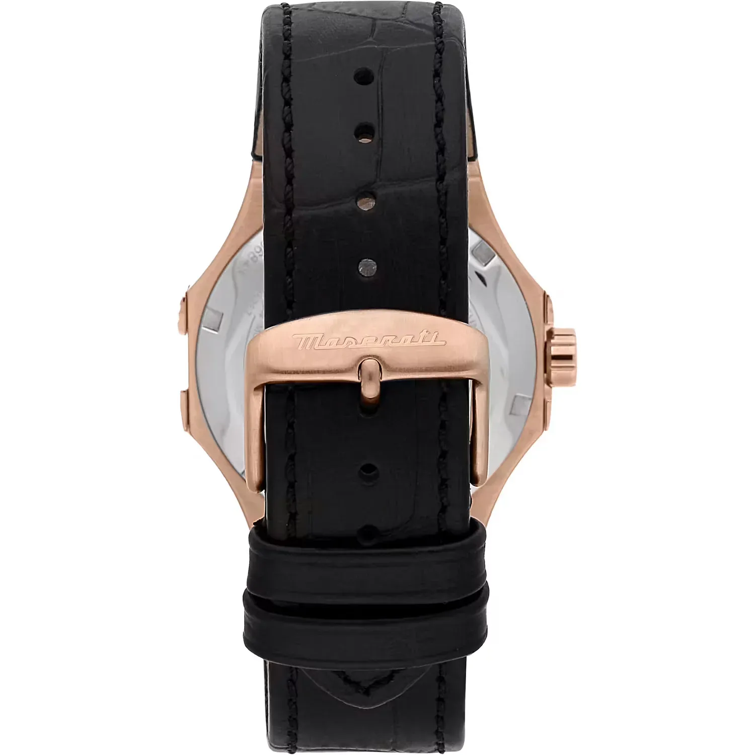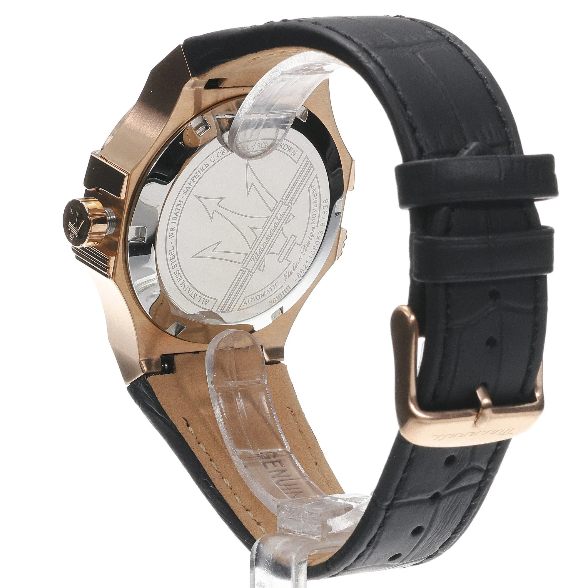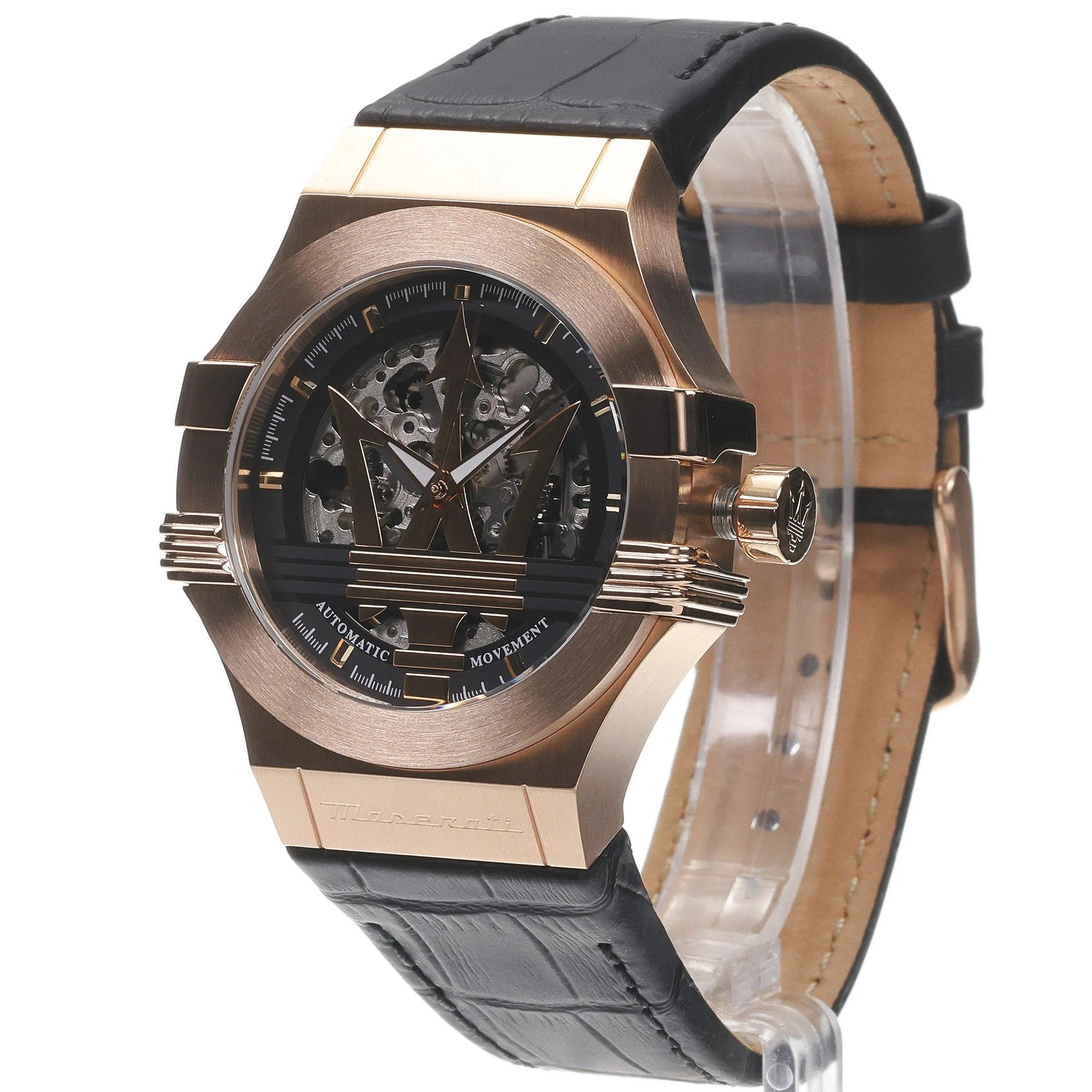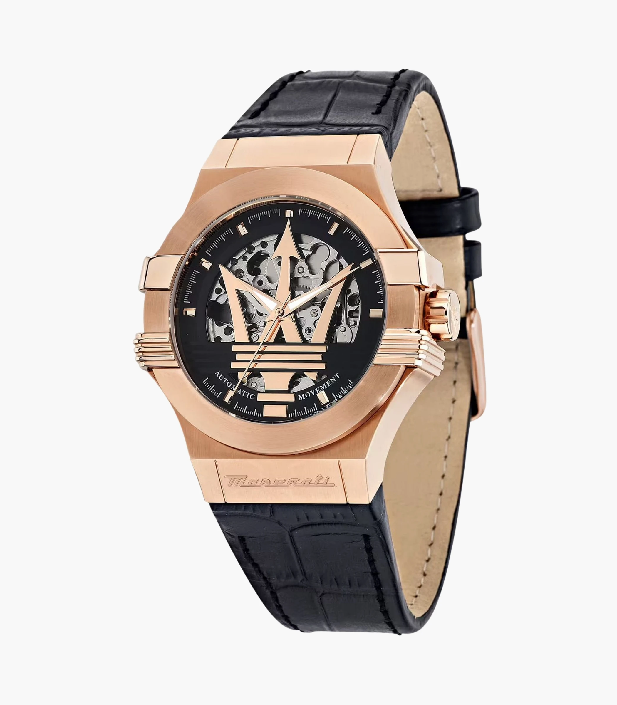 Montre Homme Maserati – Automatique, Étanche 100m, Squelette, Verre Saphir – Acier Or Rose – Bracelet Cuir Noir – 40mm – Garantie 2 ans – R8821108053
