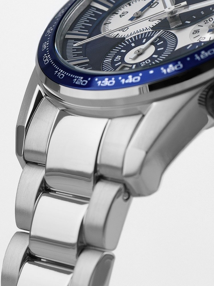 La couleur argent du boîtier fait ressortir la sophistication et permet une belle harmonie avec le cadran, qui est d’un bleu profond, évoquant à la fois la tranquillité et la modernité. Ce choix de couleur rend la montre particulièrement attrayante et facile à assortir à divers styles vestimentaires, qu’ils soient décontractés ou plus formels. Le cadran bleu est agrémenté d’index en argent qui garantissent une lisibilité optimale tout en ajoutant une touche de luxe.