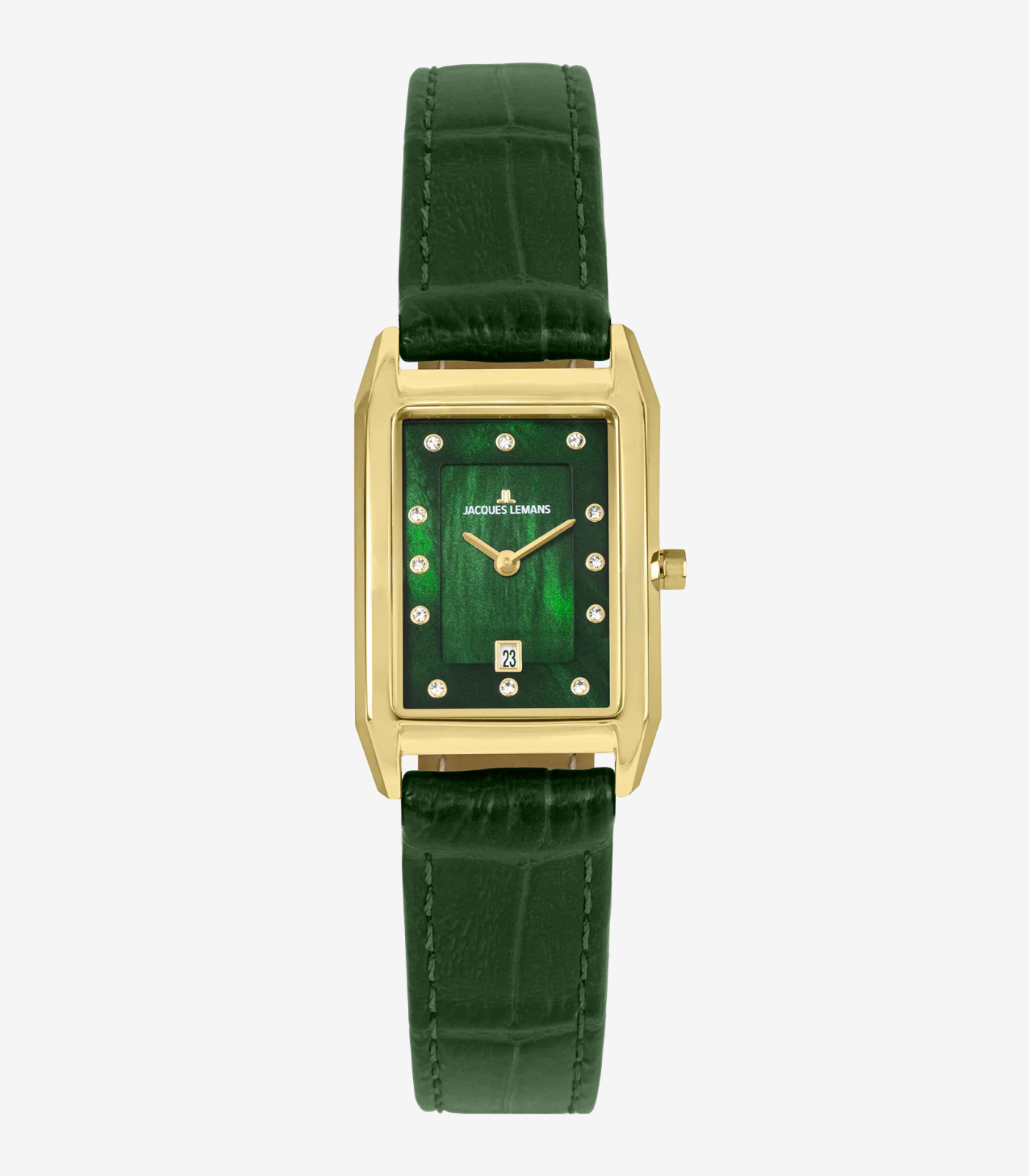 Les lignes épurées du boîtier témoignent du savoir-faire artisanal de Jacques Lemans. Chaque détail a été soigneusement pensé pour offrir à la fois une allure moderne et un charme intemporel. Le cadran, d’une teinte verte riche, est non seulement un élément visuel captivant mais également pratique, facilitant la lecture de l’heure. Les index et les aiguilles en or rose assurent une excellente lisibilité, même dans des conditions de faible luminosité.