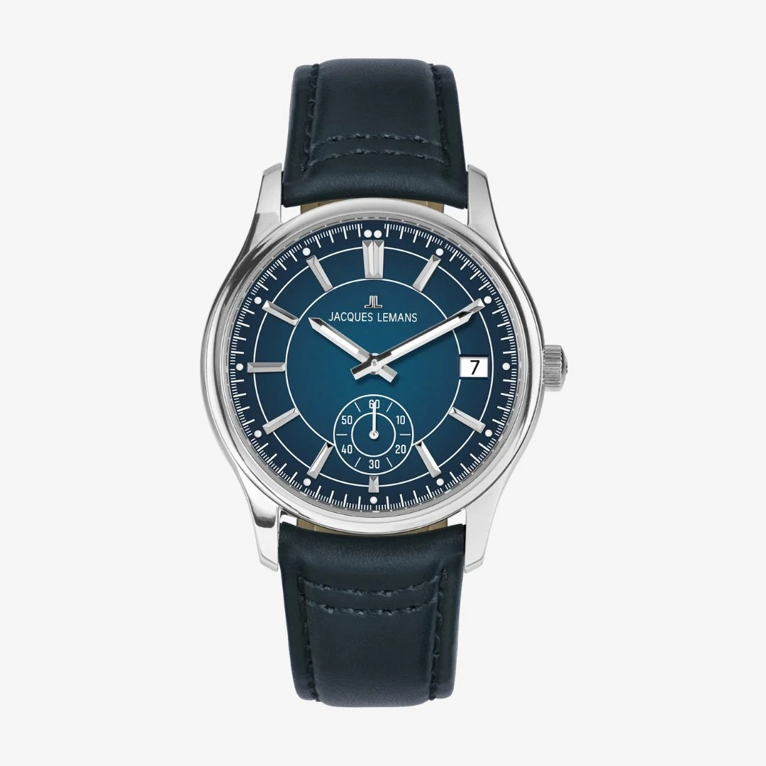 Montre Quartz Homme – Jacques Lemans – acier inoxydable, cadran Bleue, bracelet cuir, verre minéral, étanche 10 bar, date, 41 mm – 1-2197B